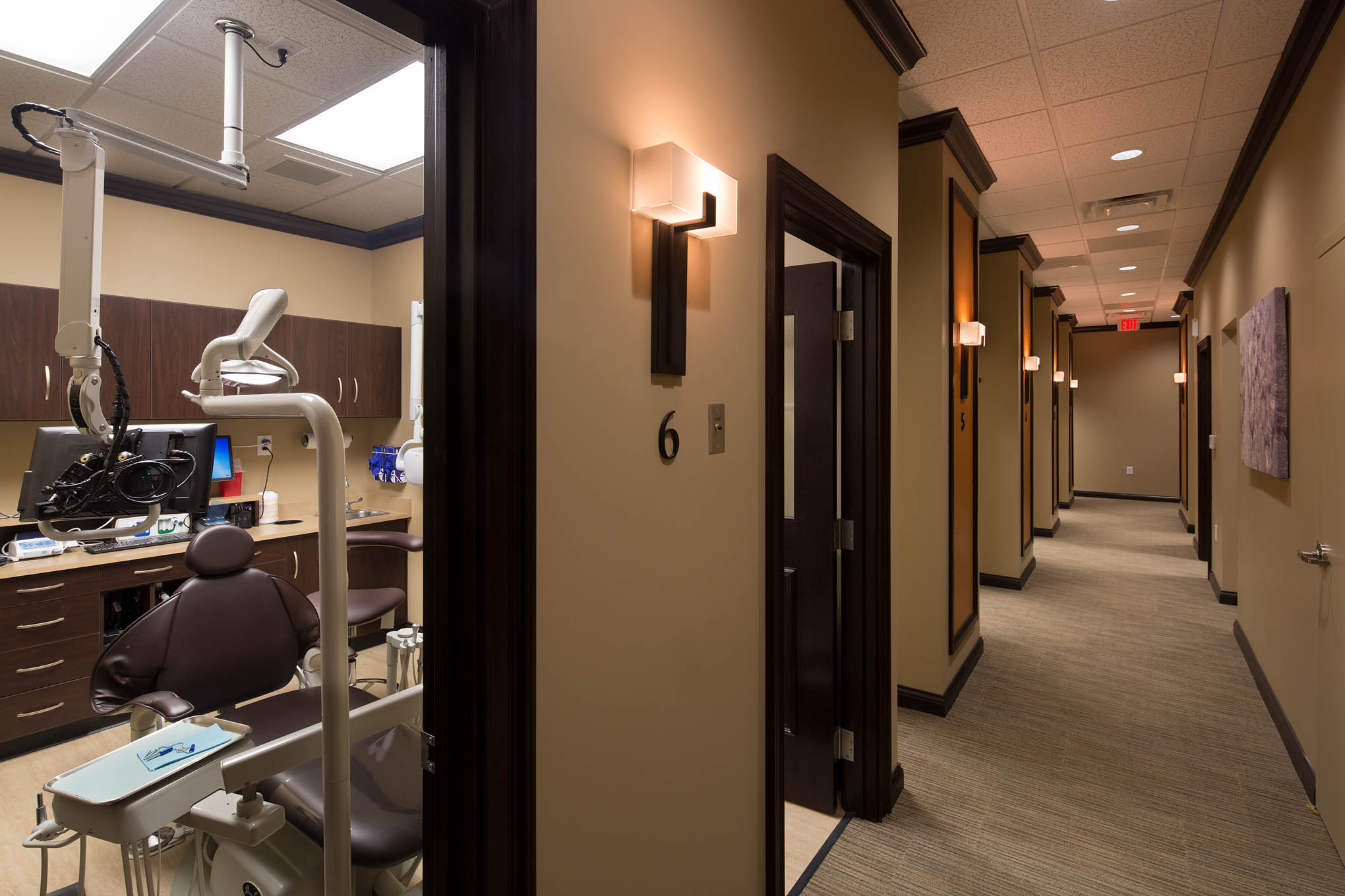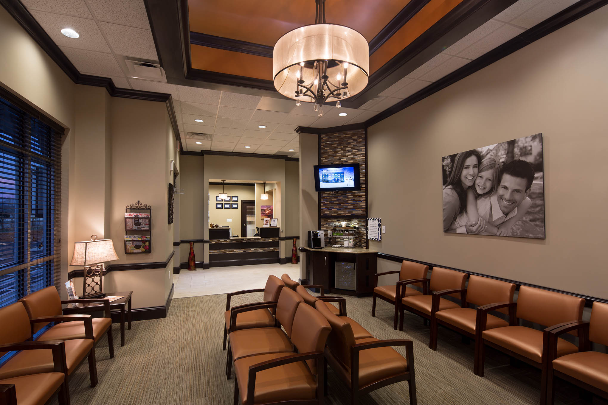 The facility features a brick-and-stone exterior with architectural accents and covered entryways designed to complement the surrounding retail development. Inside, the space was built with a focus on patient comfort and workflow efficiency, featuring: