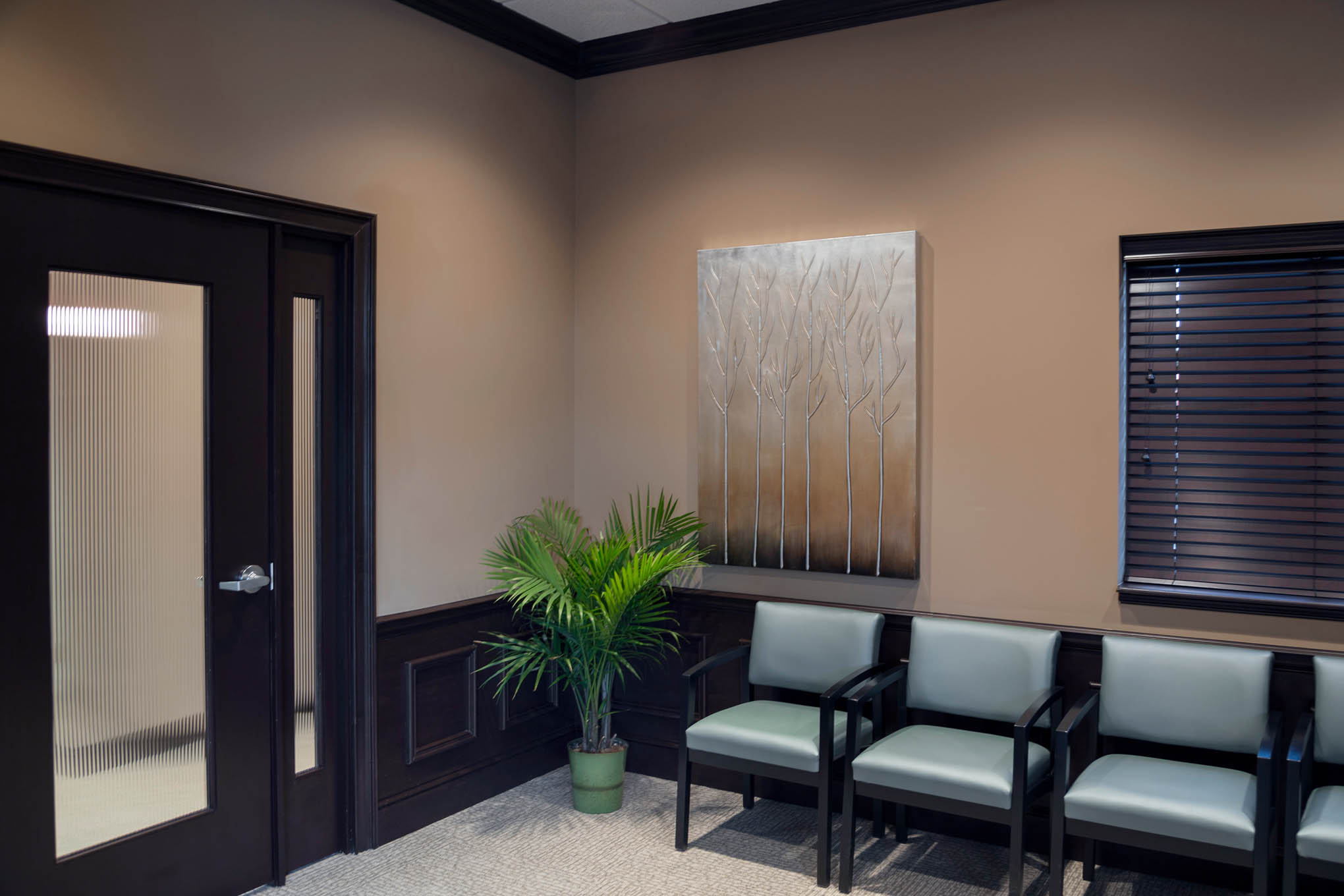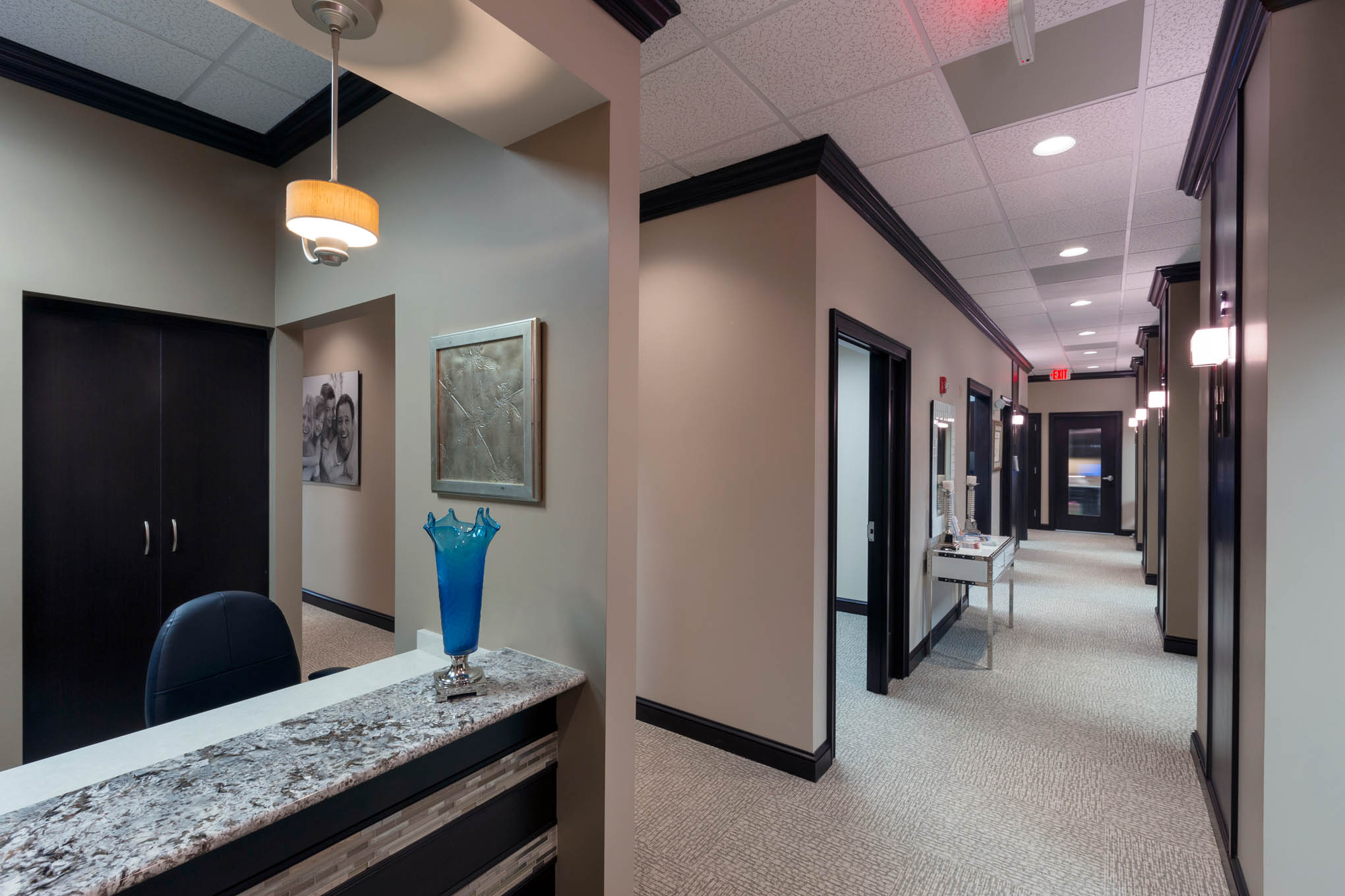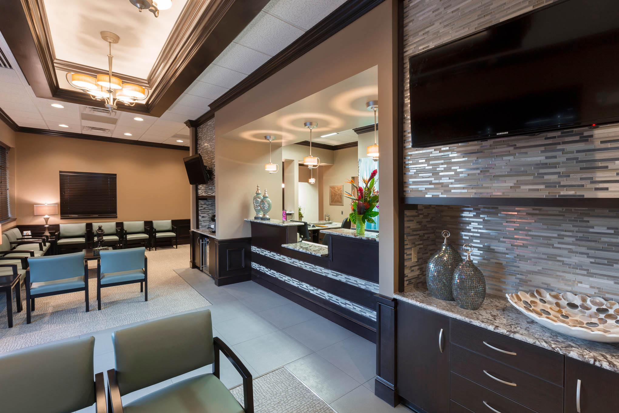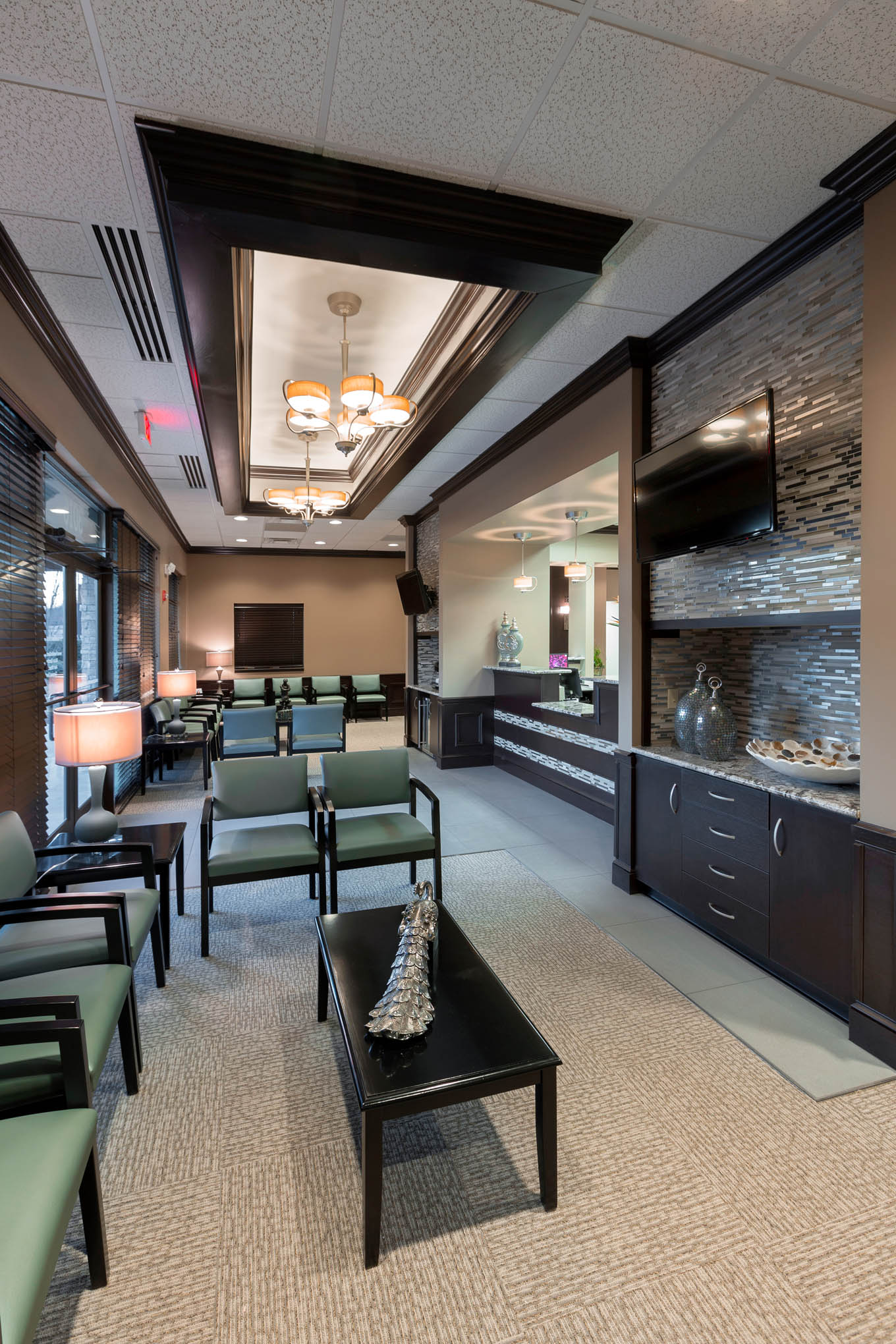 • Elegant waiting area with decorative ceilings and accent lighting