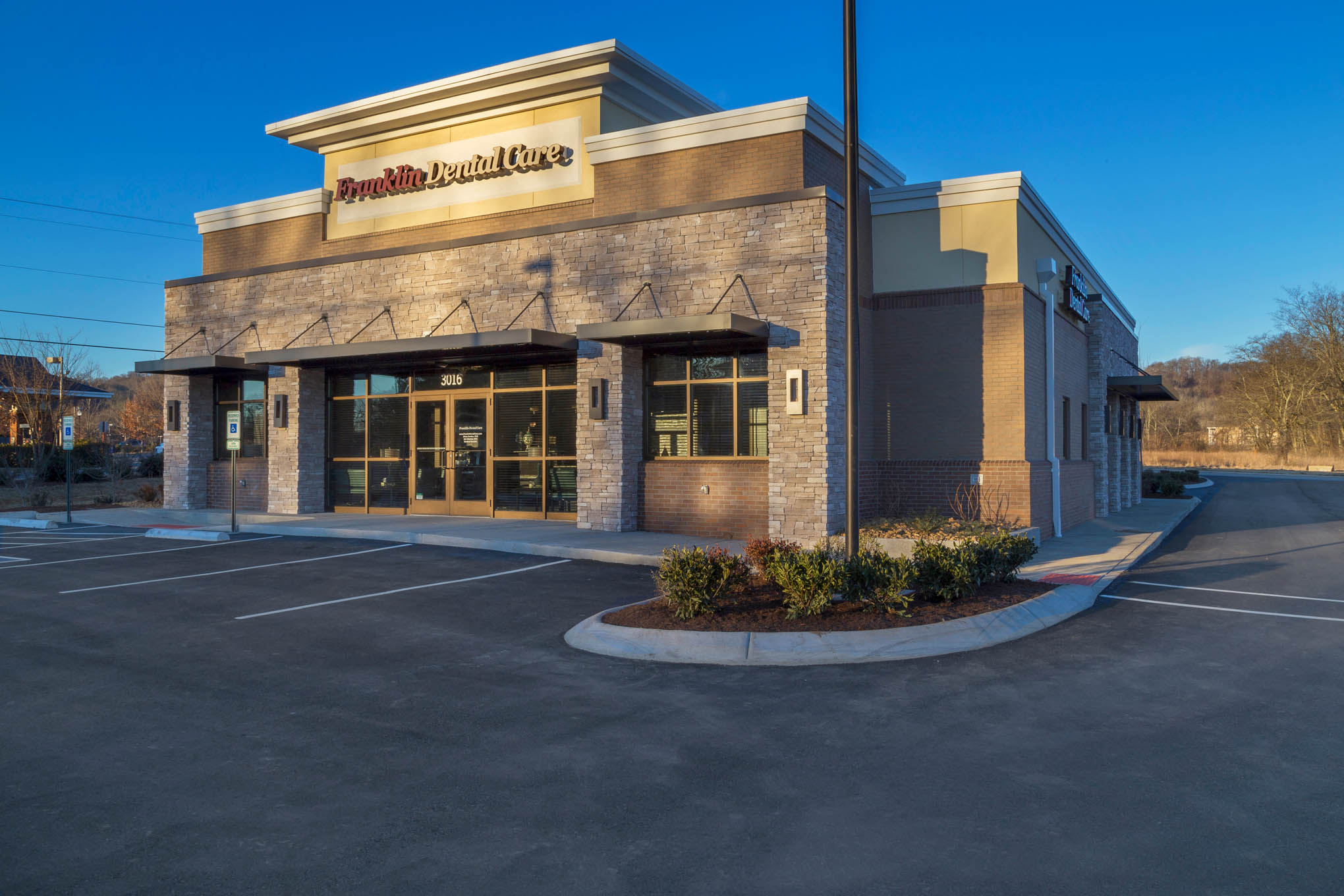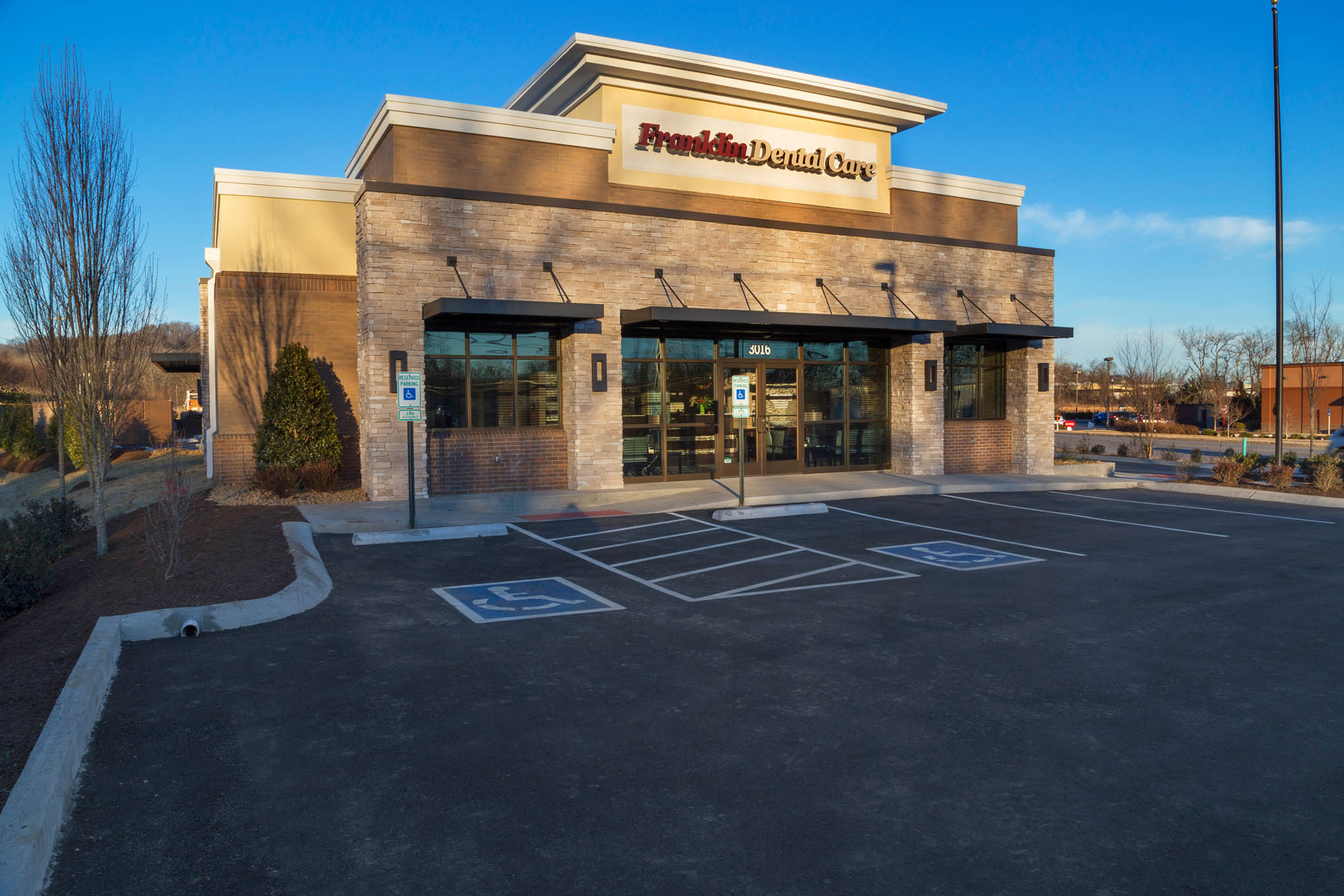 The new Franklin Dental Care building features a custom brick façade with clean architectural lines and modern signage, establishing a professional and recognizable presence within the community. Inside, Romach built fully equipped treatment rooms, a spacious patient lobby, and administrative areas with high-end finishes and energy-efficient lighting.